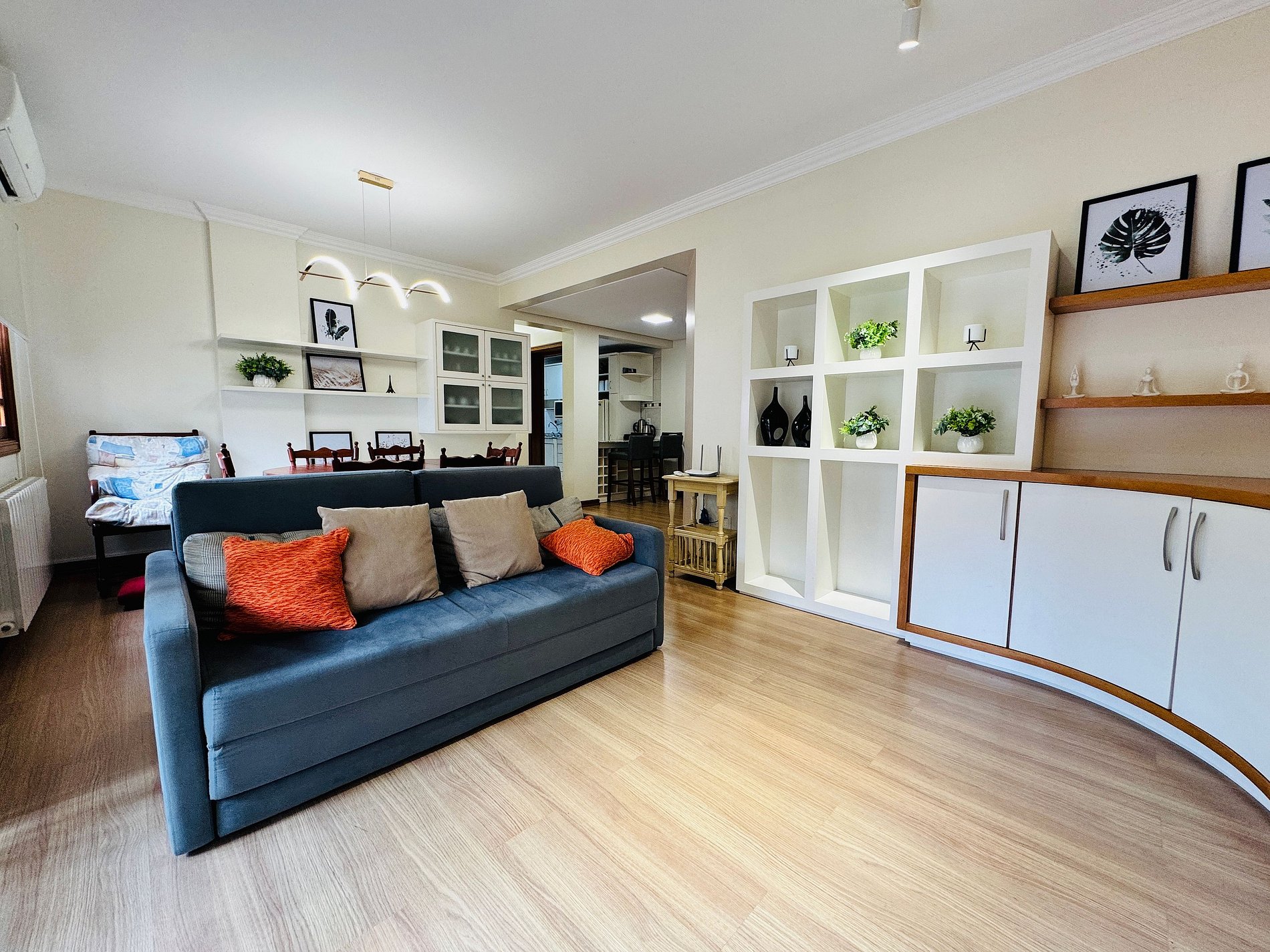 * Sala de estar (com sofá cama) iluminada, espaçosa SMART TV e varanda com vista para a cidade
