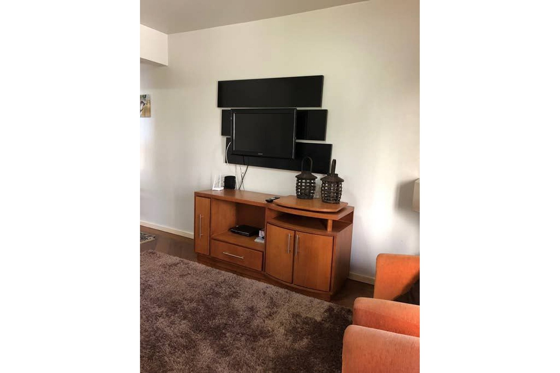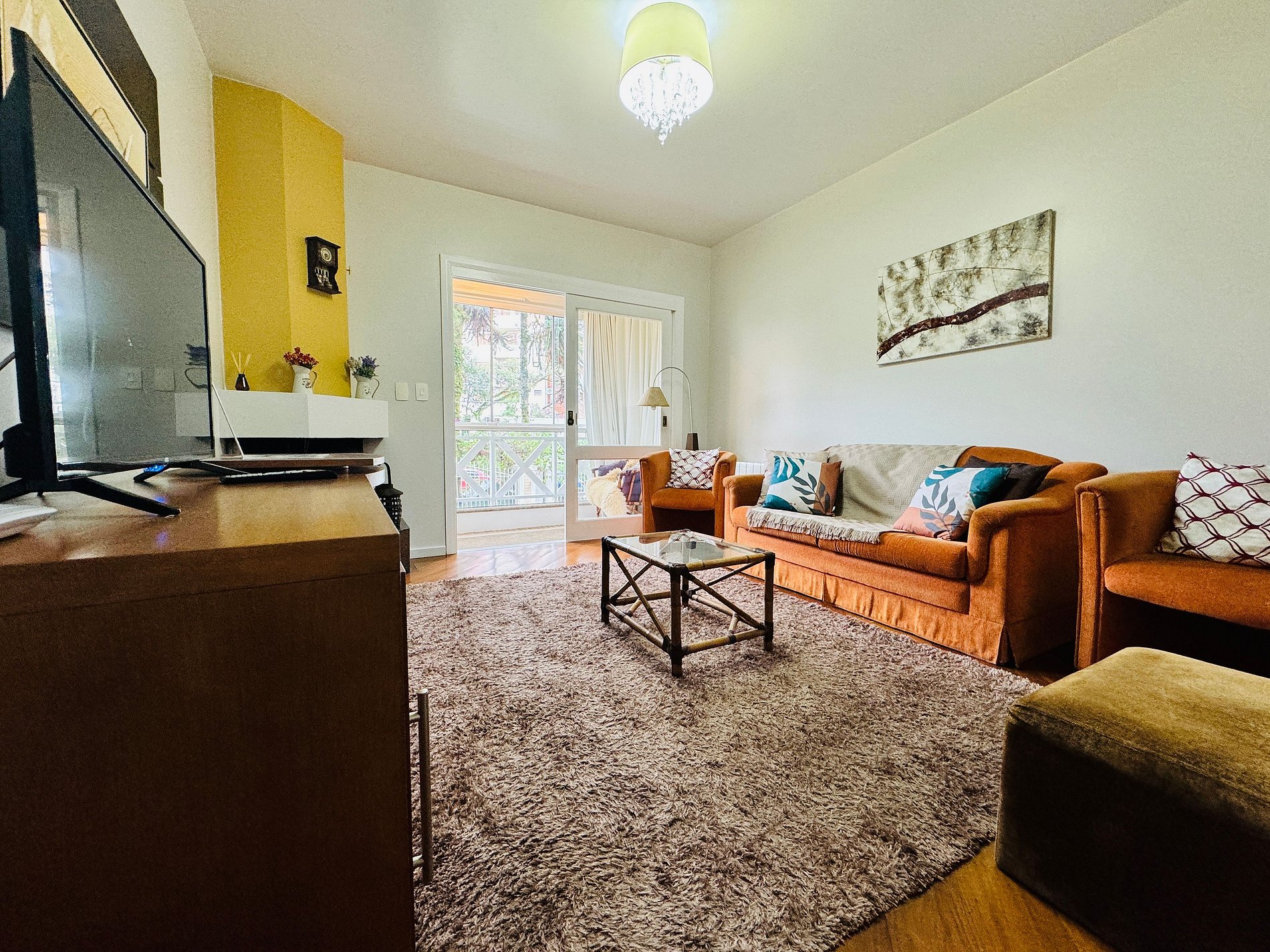 * Sala de estar confortável com TV 42 polegadas`, WIFI 120 Mbps, e uma gostosa lareira que está integrada com a varanda para contemplar a vista do condomínio e também das mediações.