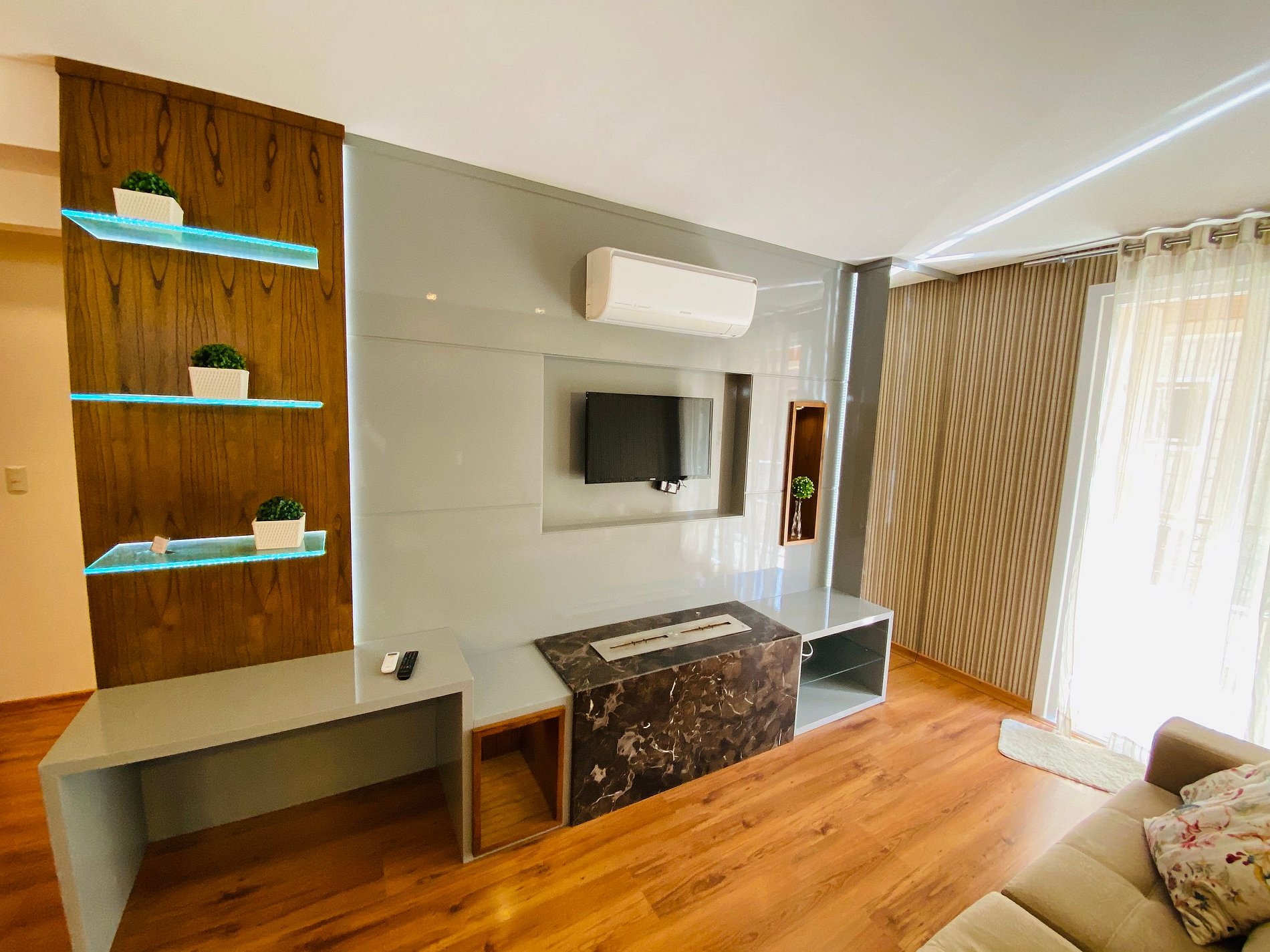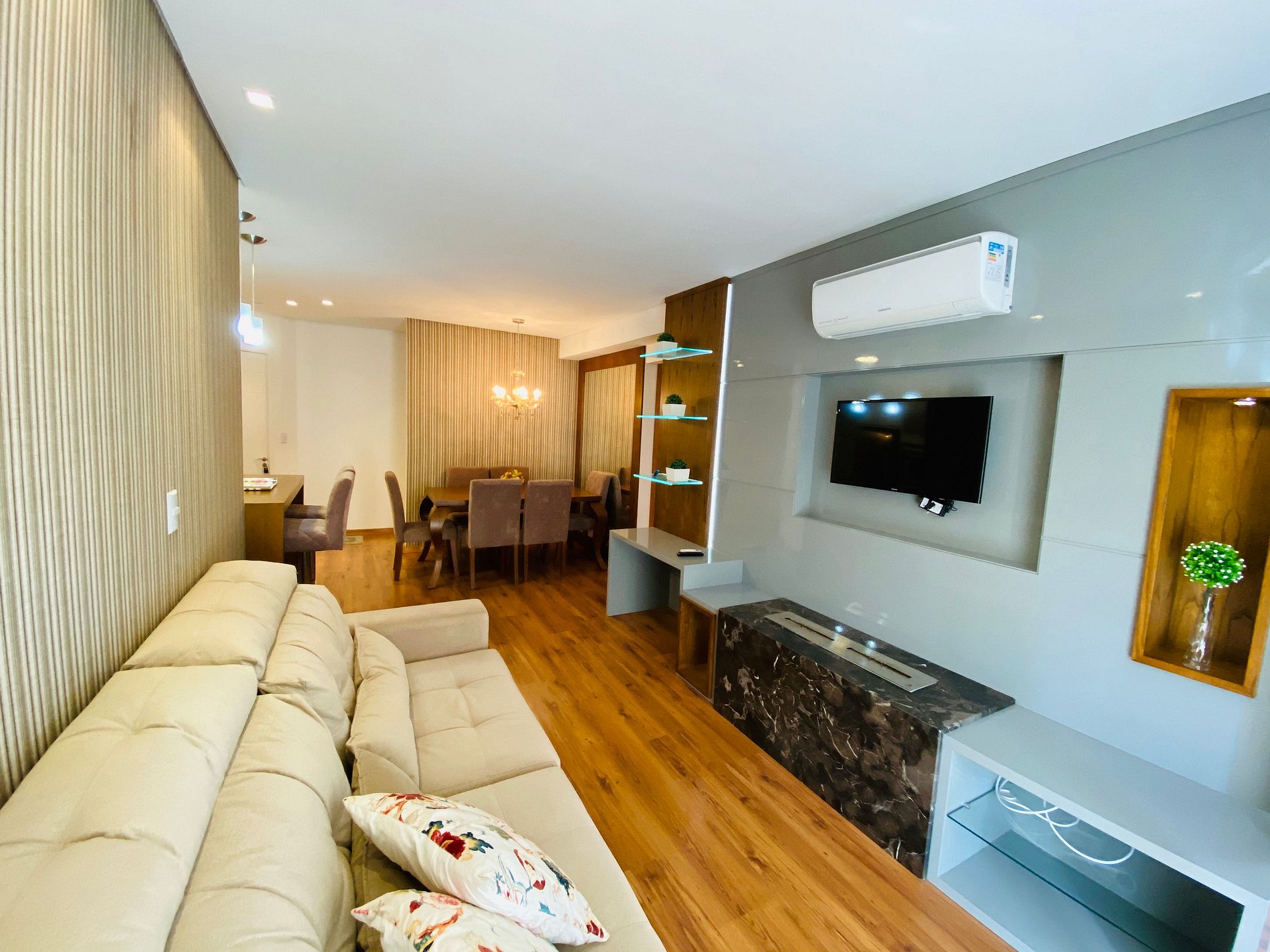 * Sala de estar decorada com mobília em tons off-white, lareira ecológica , sofá retrátil e espaçoso