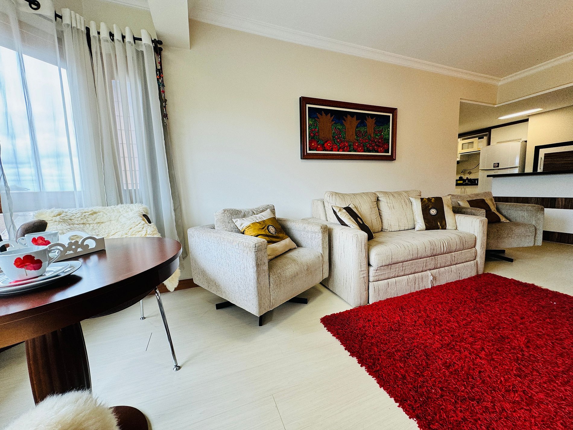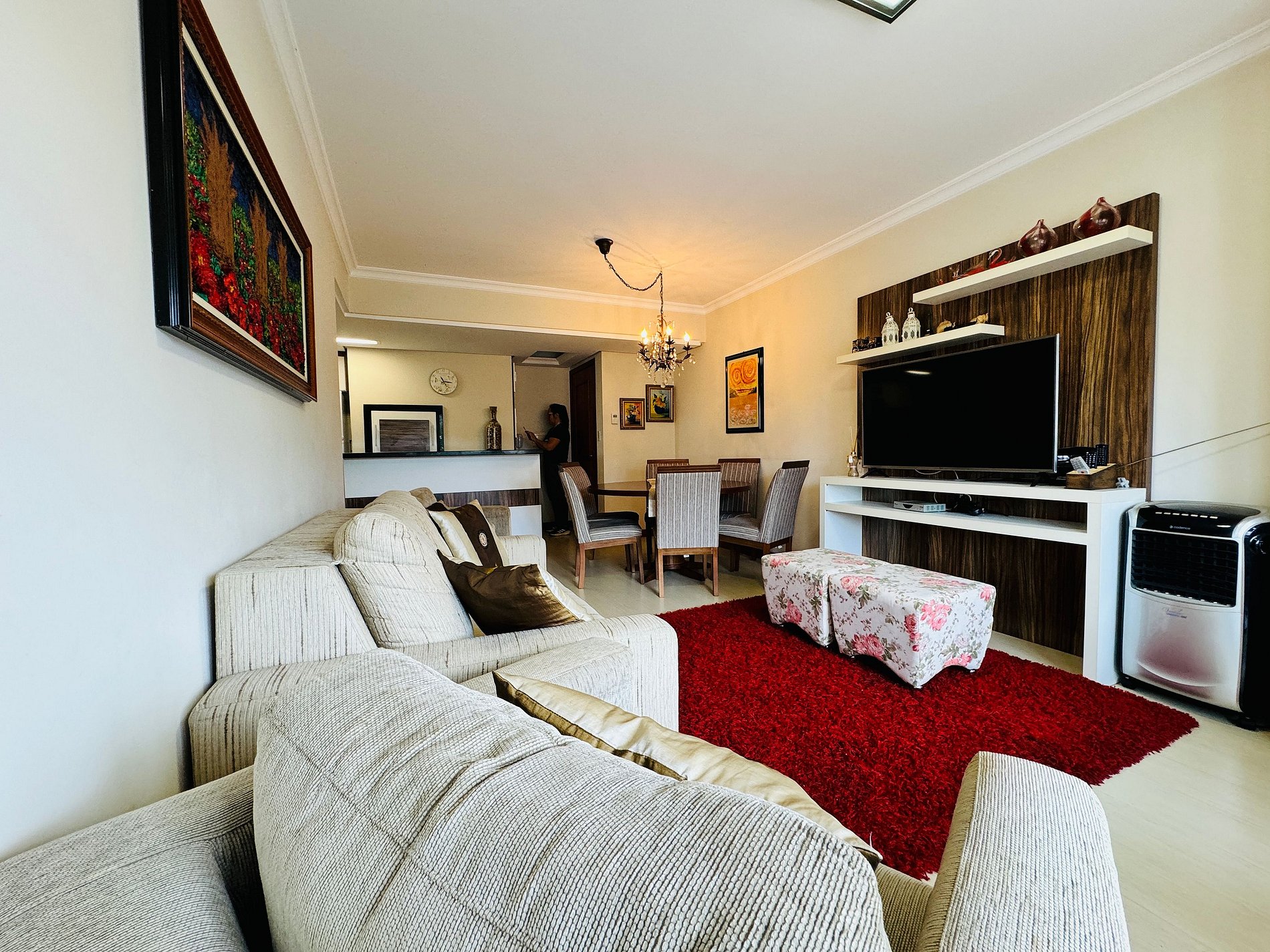 * Ampla e confortável sala de estar com Smart TV de 42 polegadas e canais de streaming, WIFI de 120Mbps + split de 12000 BTUs integrada á cozinha e á sala de jantar possibilitando momentos de maior descontração entre amigos e família;