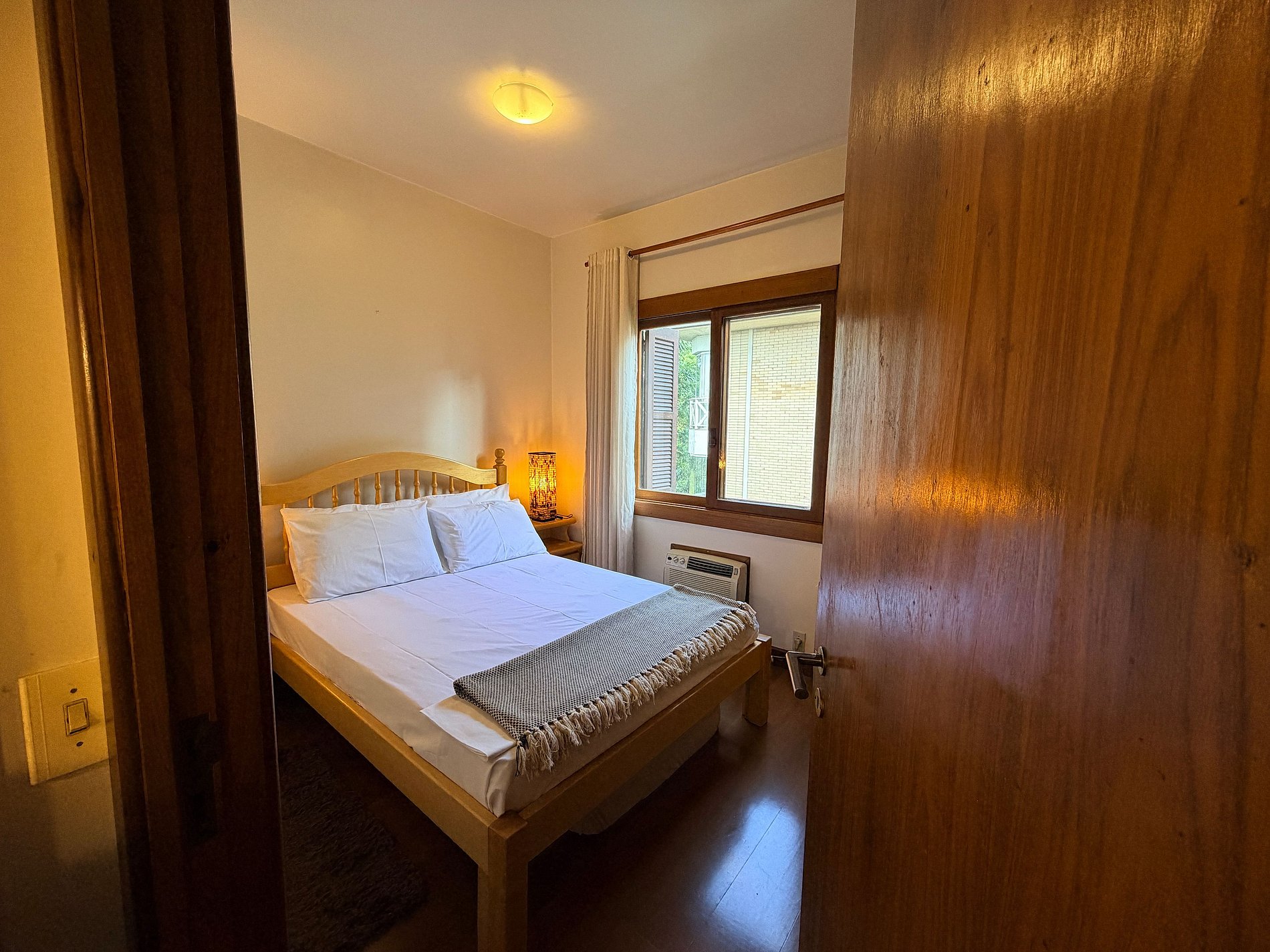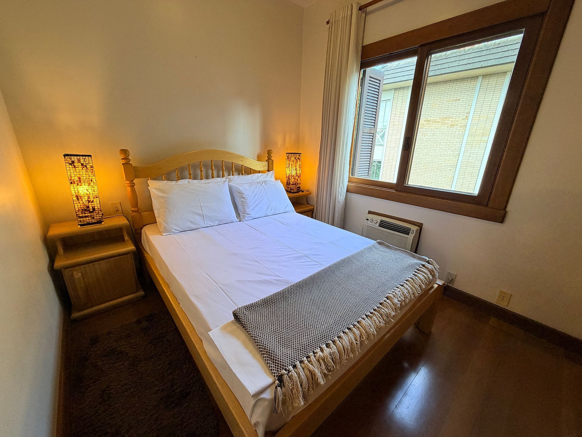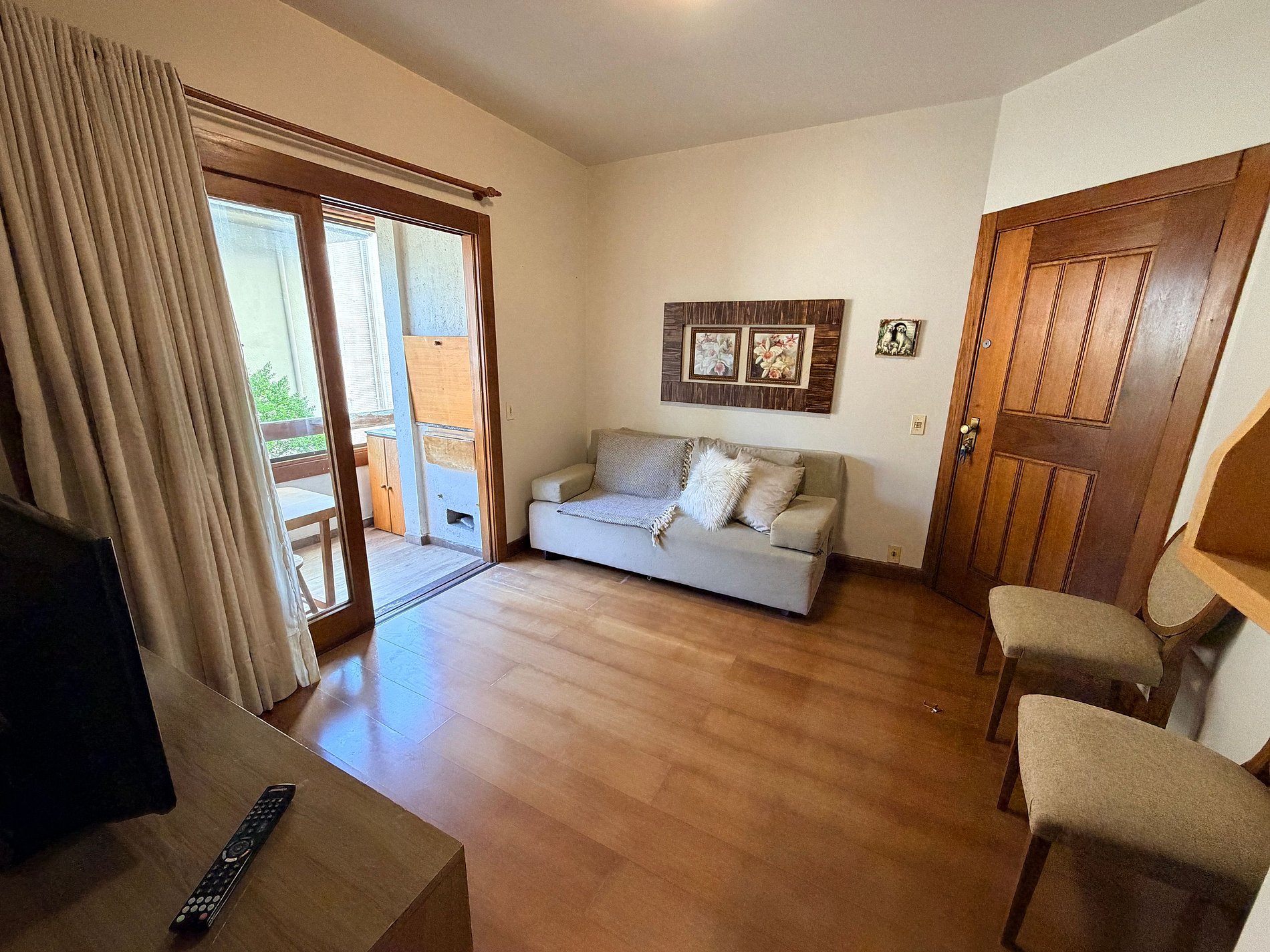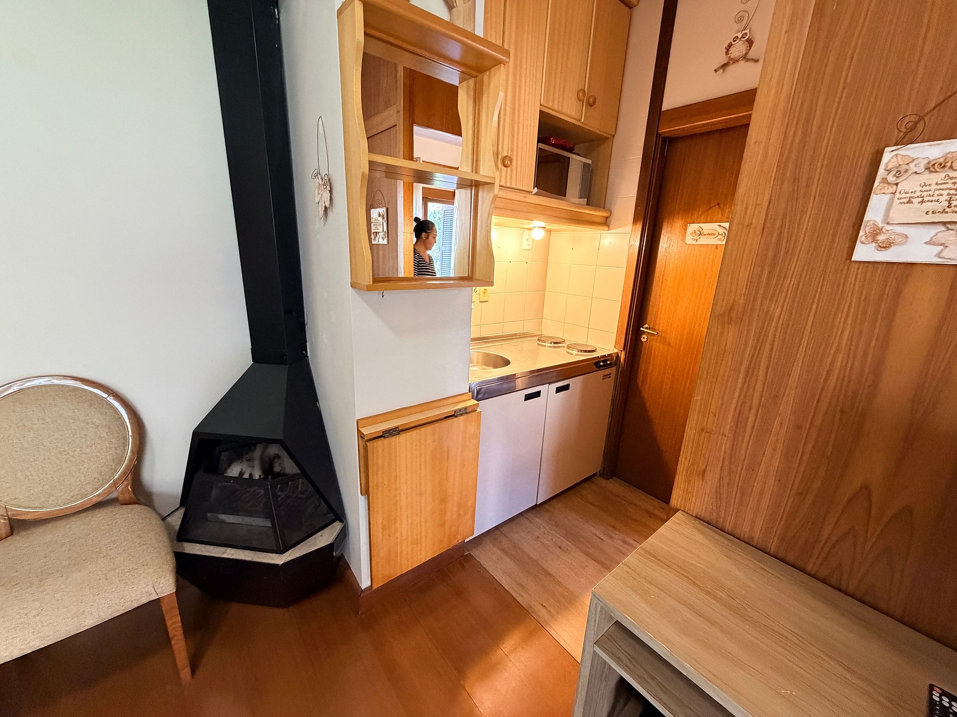 Apartamento de 1 dormitório com uma ampla e iluminada sala de estar que acomoda até 4 pessoas de forma confortável. Dispomos de uma compacta cozinha integrada á sala de estar com lareira (a lenha) e uma varanda (com vista) com churrasqueira e pia de apoio.