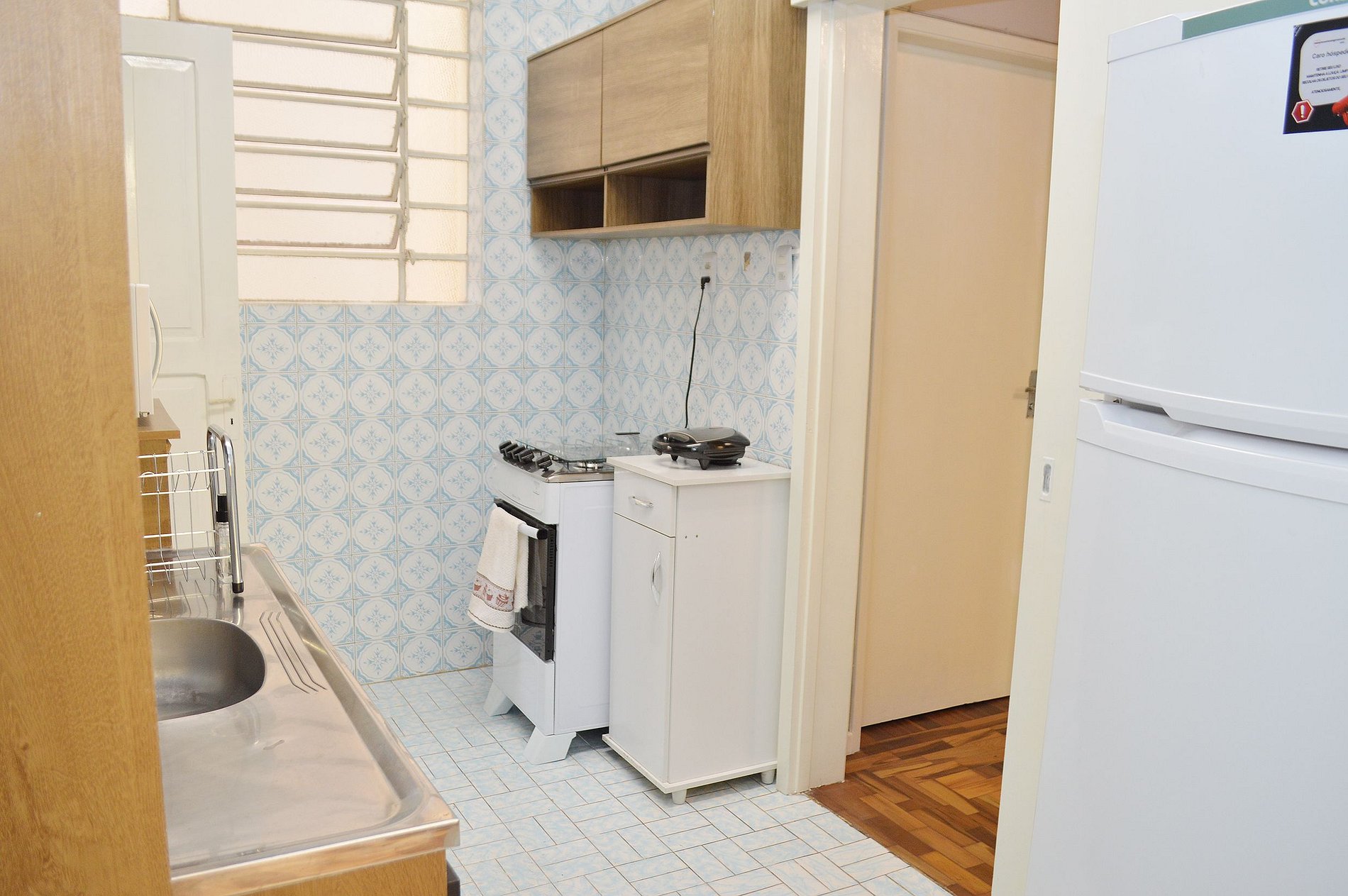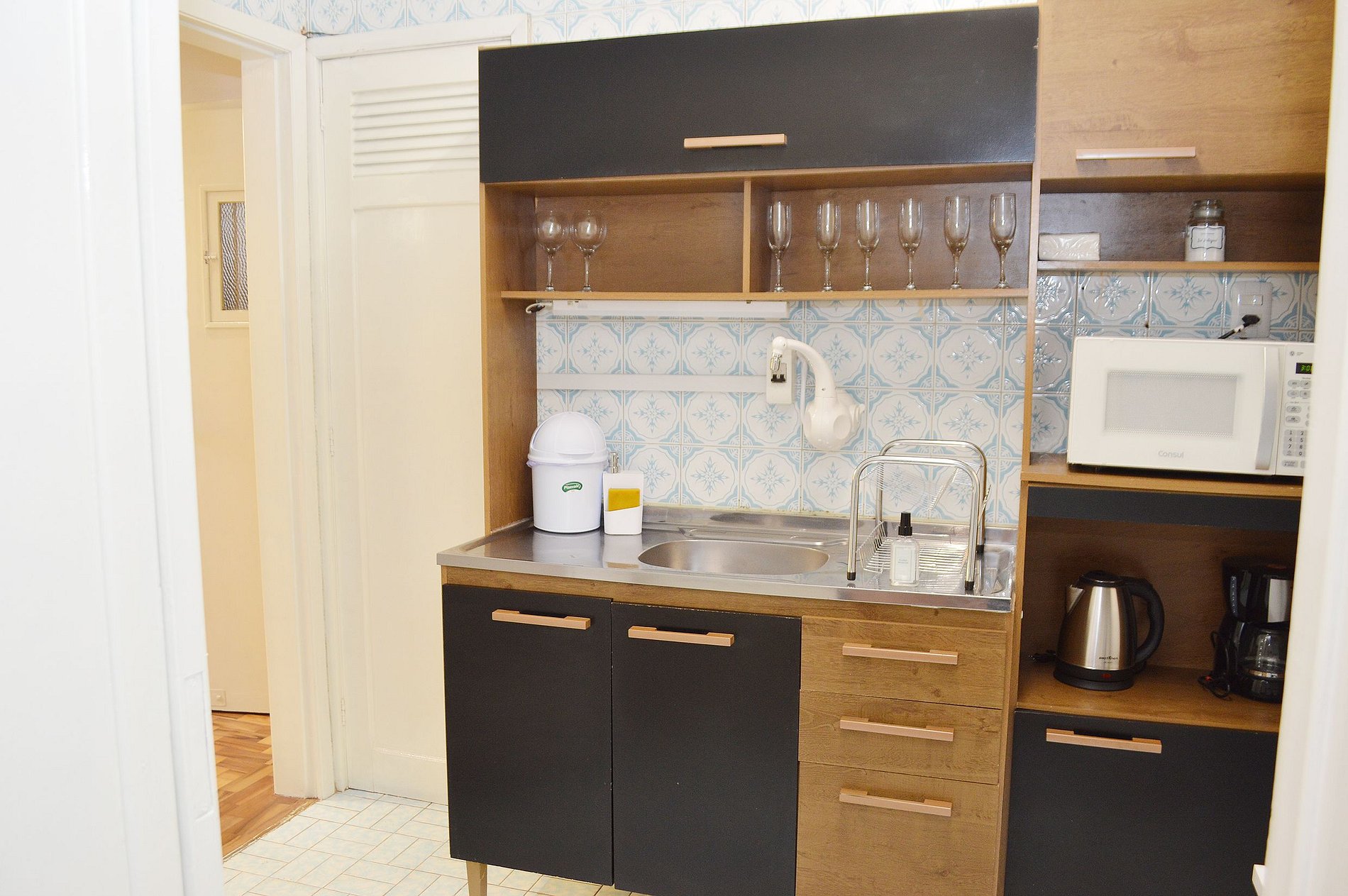 * Cozinha com geladeira, forno e fogão, micro - ondas, torradeira e utensílios (panelas, copos, talheres, entre outros) necessários para o preparo das refeições;