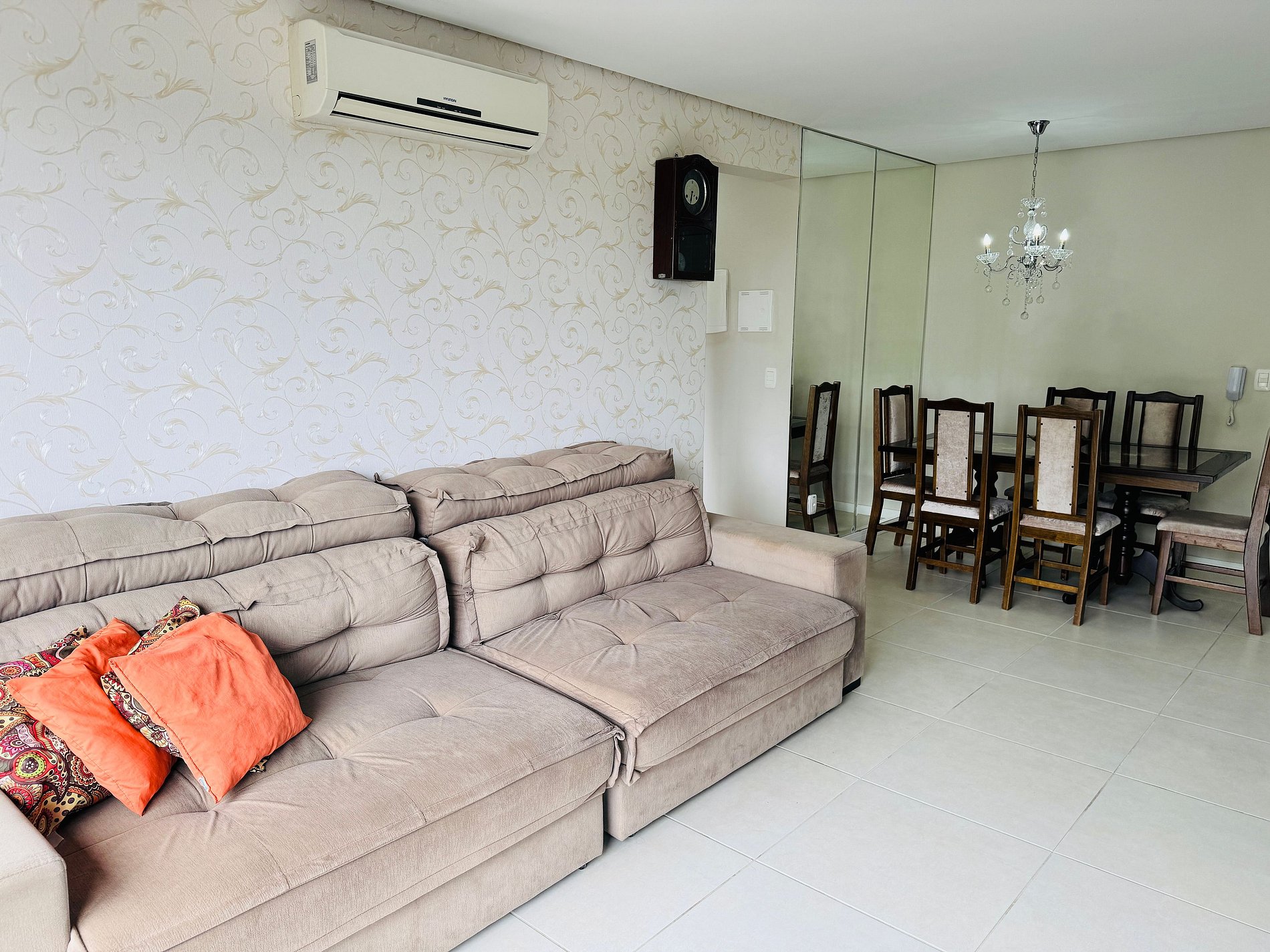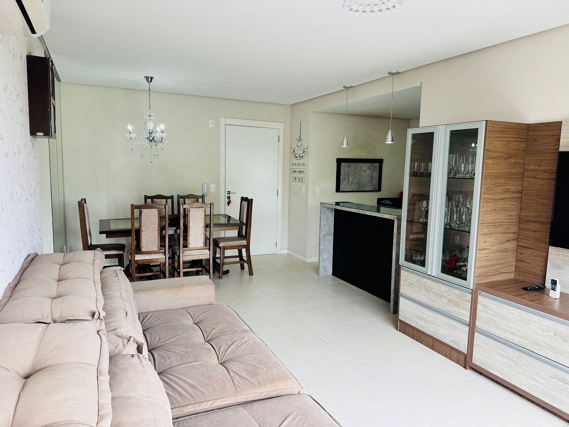 * Sala de estar iluminada, espaçosa com mesa de jantar para 6 pessoas, SMART TV e varanda com vista para a cidade