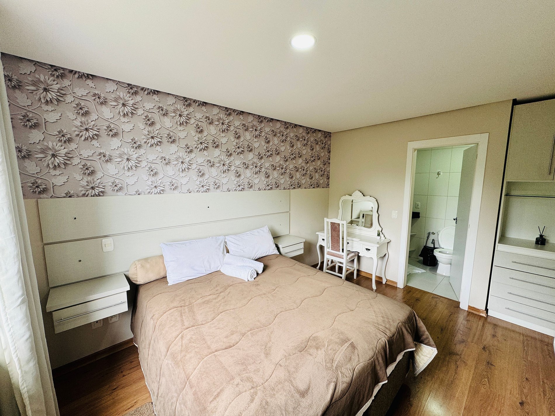 Nossa acomodação situada no 3 andar dispõe de um espaço amplo e tranquilo para momentos em família. São 2 dormitórios (sendo 1 suíte) + banheiro social.