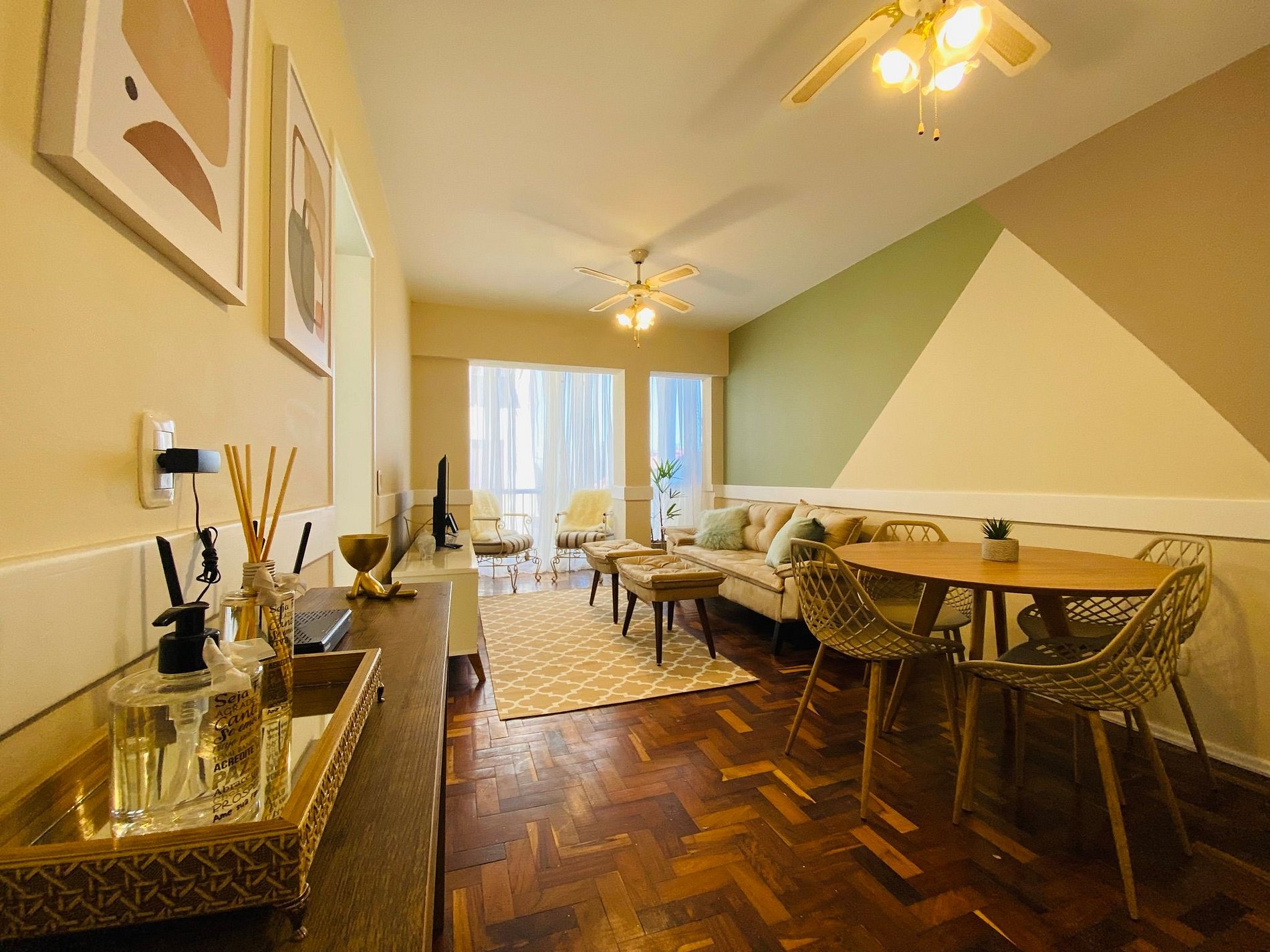 Quadros decorativos, luminárias de apoio, sofá com puffs, almofadas, cortinas e ventiladores de teto também compõem a decoração desta linda sala de estar que ainda conta com SMART TV (Canais de streaming) e com uma pequena e aconchegante varanda para momentos de descontração e bate papos;