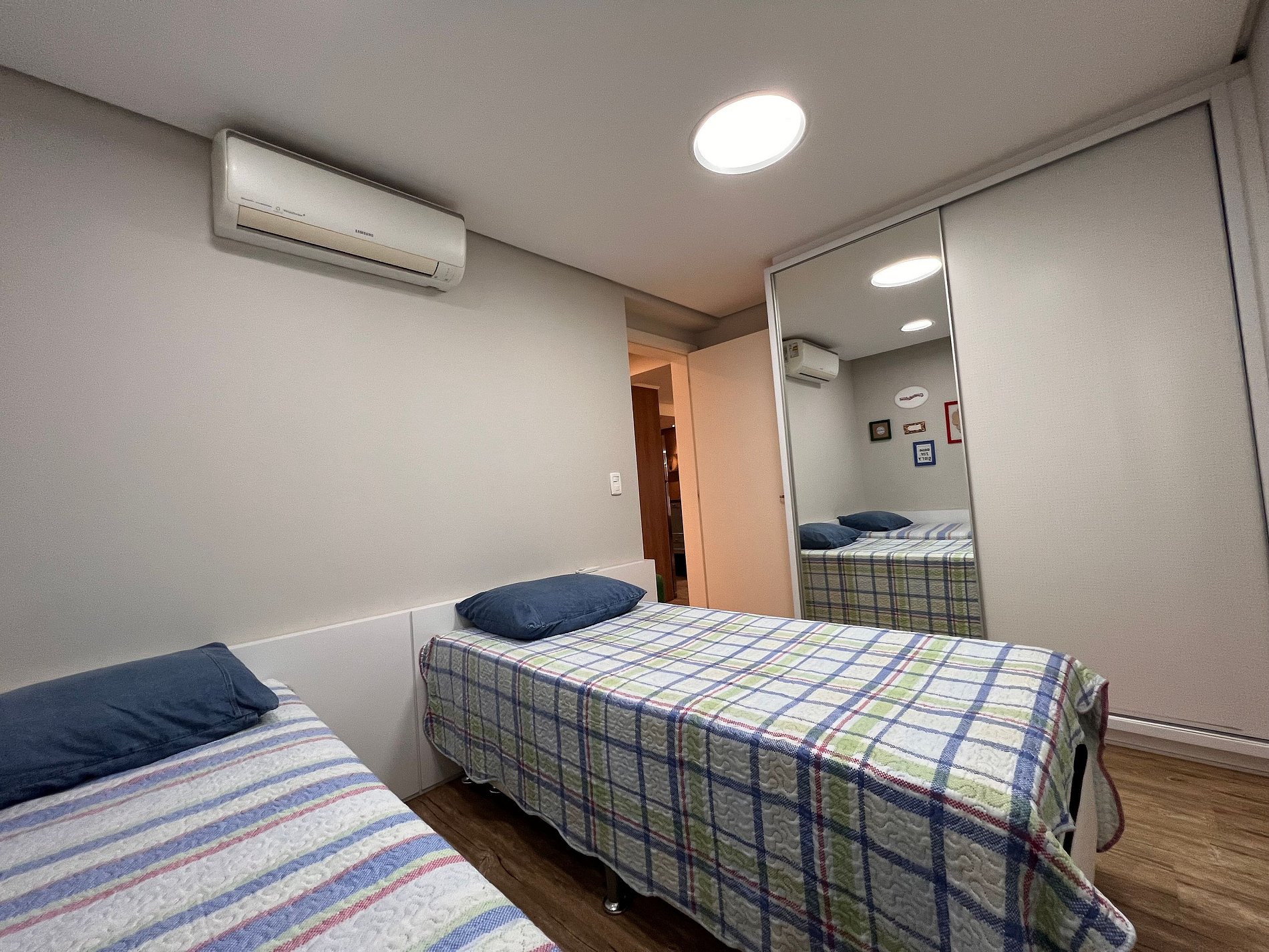 * Quarto com 2 camas de solteiro, armário com cabides, AR CONDICIONADO SPLIT e janela acústica com cortinas blackout;